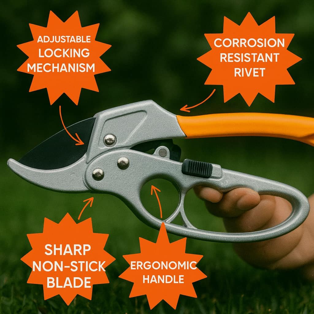 - [Quality Blades] – Professionally built utilizing SK-5 Steel that meets the highest standards and gives you precision on each cut. Ideal use for light branches of trees, rose bush, shrubs, and hedges. Incredibly sharp tree trimmers with High Carbon Steel Blade with non-stick protective coating. Razor sharp curved cutting blade maximizes cutting effectiveness, cuts cleanly every time without crushing plant material.